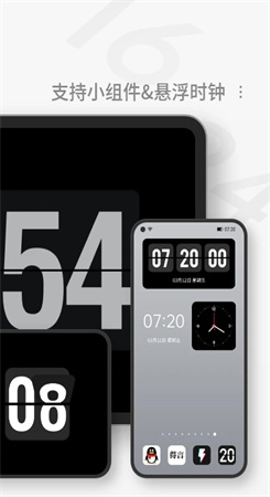 极简翻页时钟设计,支持横屏及竖屏。可设置为手机屏保时间、桌面悬浮时钟小组件,方便查看时间。