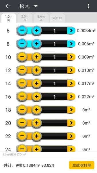 材积计算器手机版介绍:木材行业实用工具,快速体积计算,体积表查询,可针对不同树种、长度、直径设置价格,最终快速计算总价,分类清晰,结果清晰,计算结果可共享。